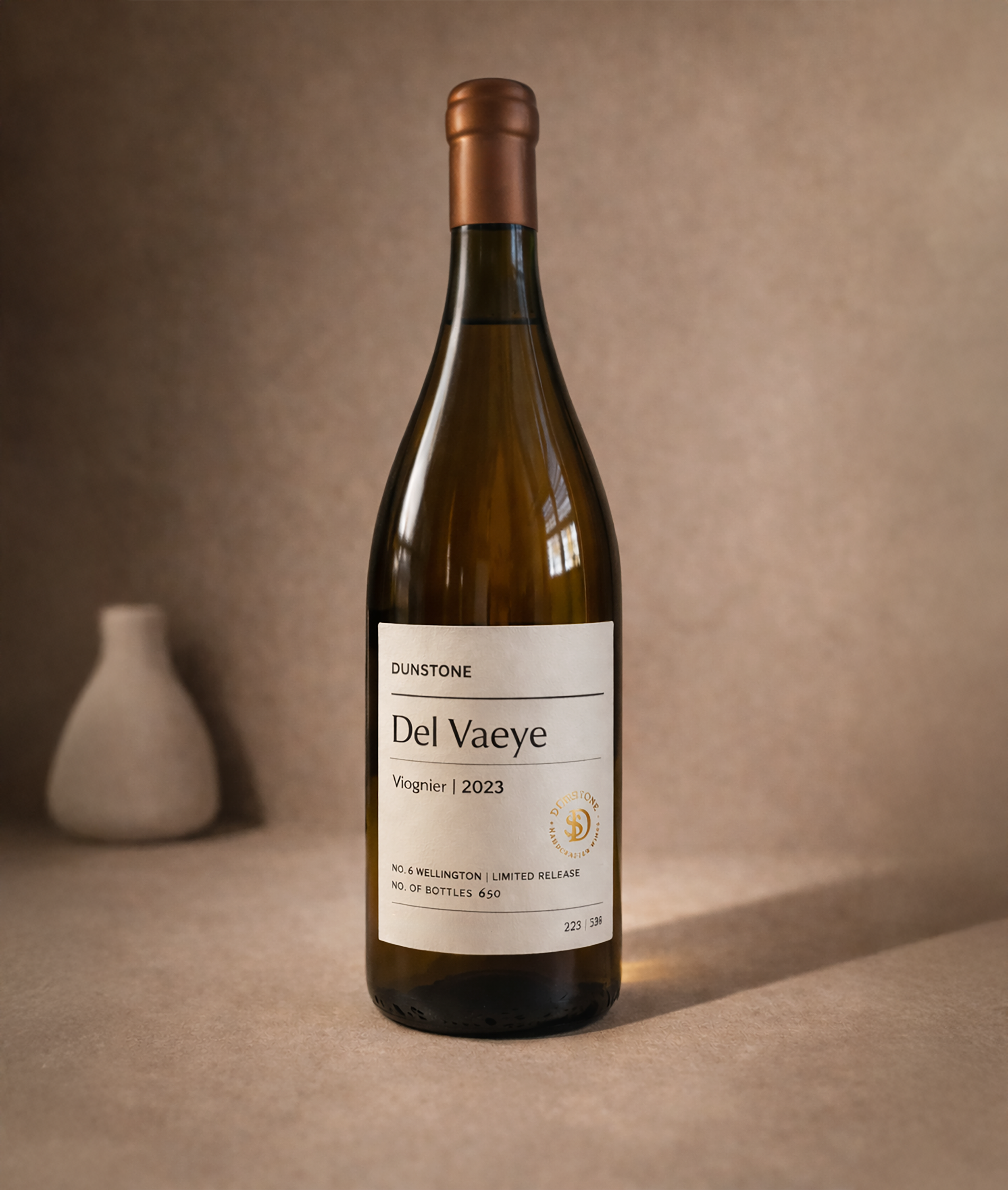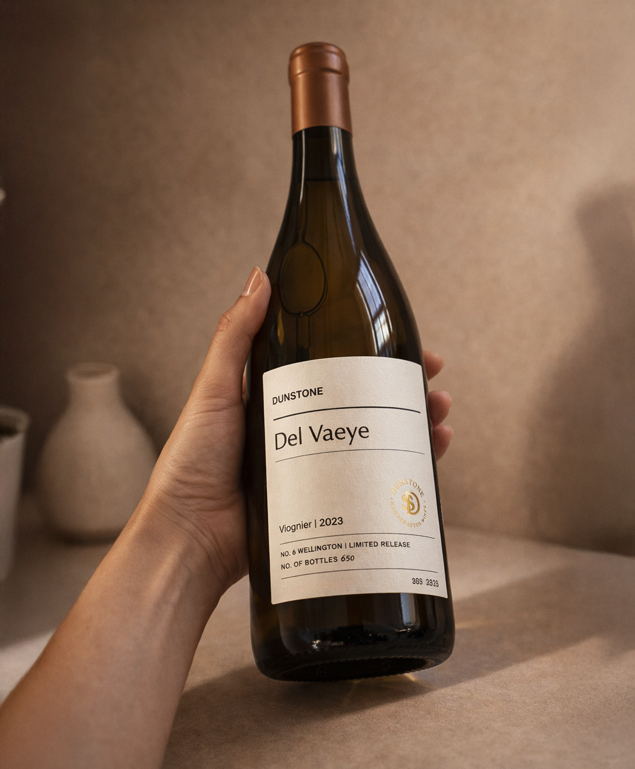 As part of the Dunstone Estate winery, The Del Vaeye label is intentionally minimal, allowing restraint and materiality to speak first. A calm typographic hierarchy, generous white space, and warm neutral tones reflect the elegance of the Viognier and the considered,